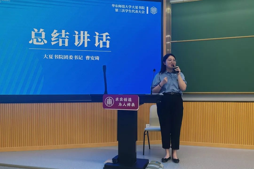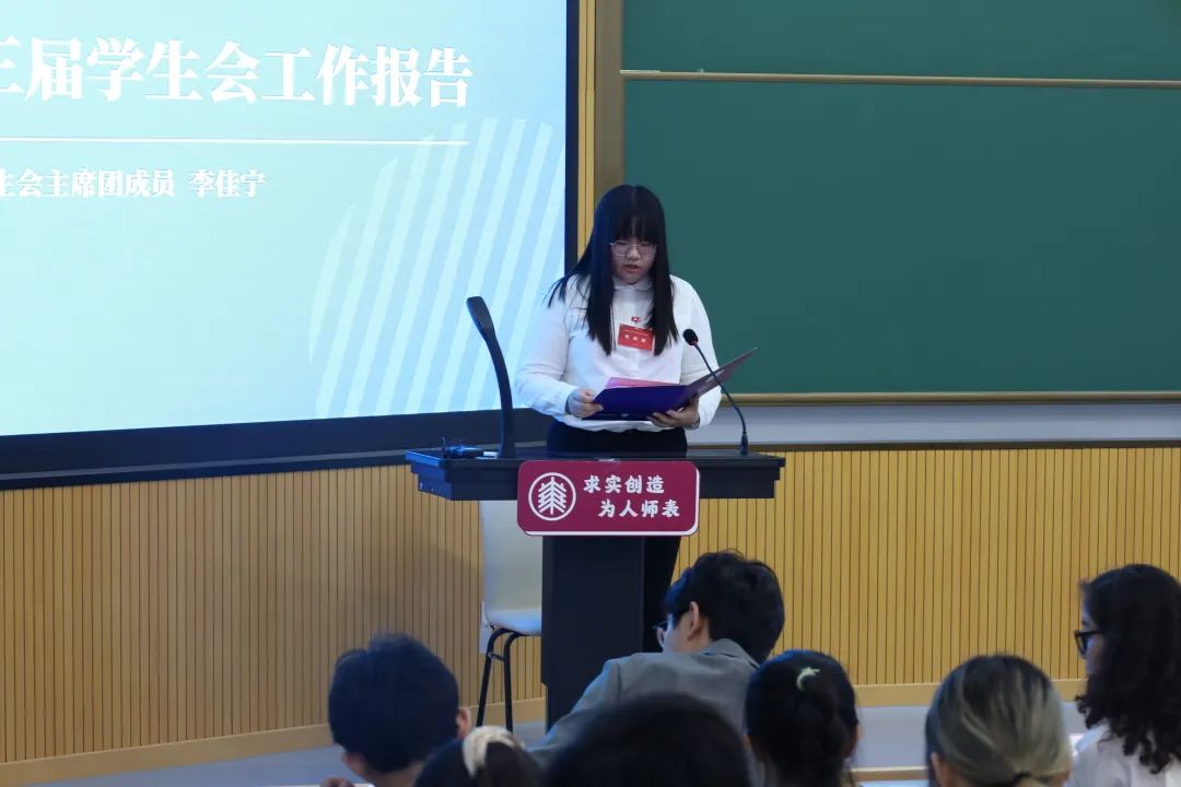 接着,2018级汉语言文学专业学生、书院学生会主席团成员李佳宁作《逐梦百年砺初心,追求卓越共奋进——华东师范大学大夏书院第三届学生会工作报告》。报告分为“回首向来处,历久更弥新、“担负新使命,举旗开新篇”、“展望新气象,建设新篇章”三个部分,从思想引领、队伍建设、组织建设、品牌建设等多个方面全面深入的总结了大夏书院学生会一年以来的有益探索和丰硕成果。站在建党一百周年、建校七十周年的时间节点上,书院学生会必将不断探索团学工作新局面,与广大青年学子心怀“国之大者”,为服务国家富强、民族复兴、人民幸福贡献力量,为党和祖国更美好的明天不懈奋斗。