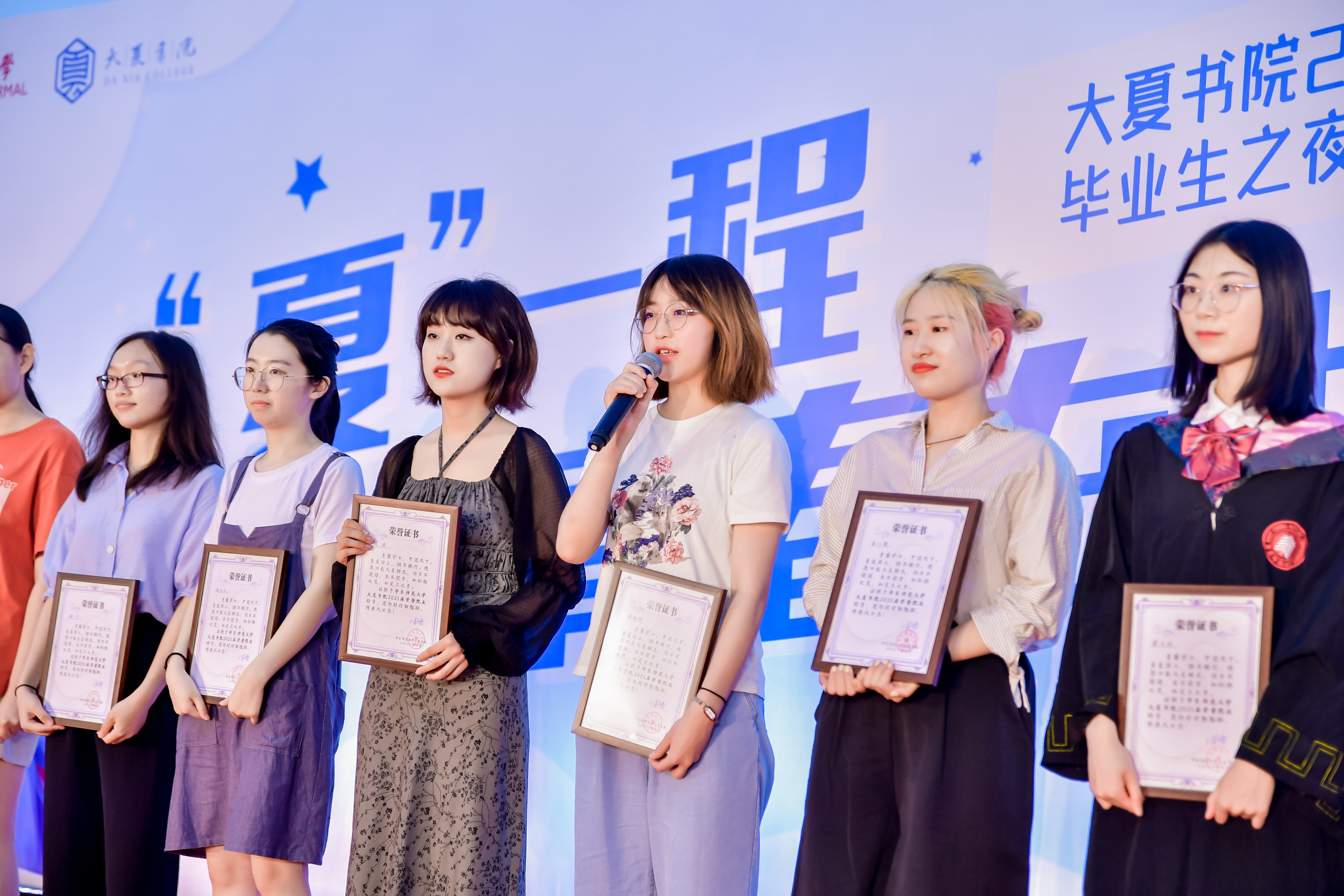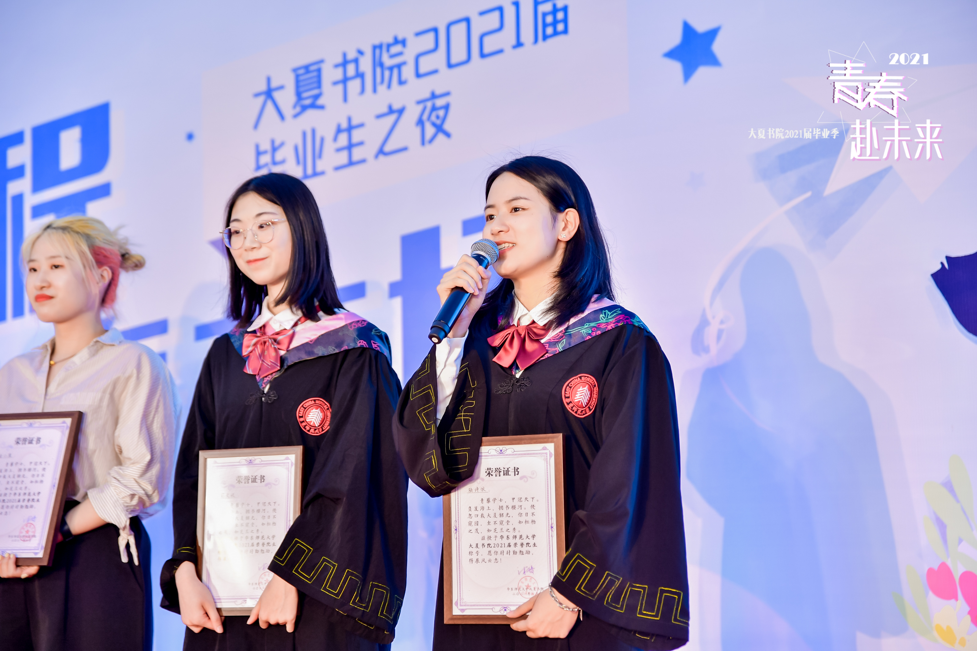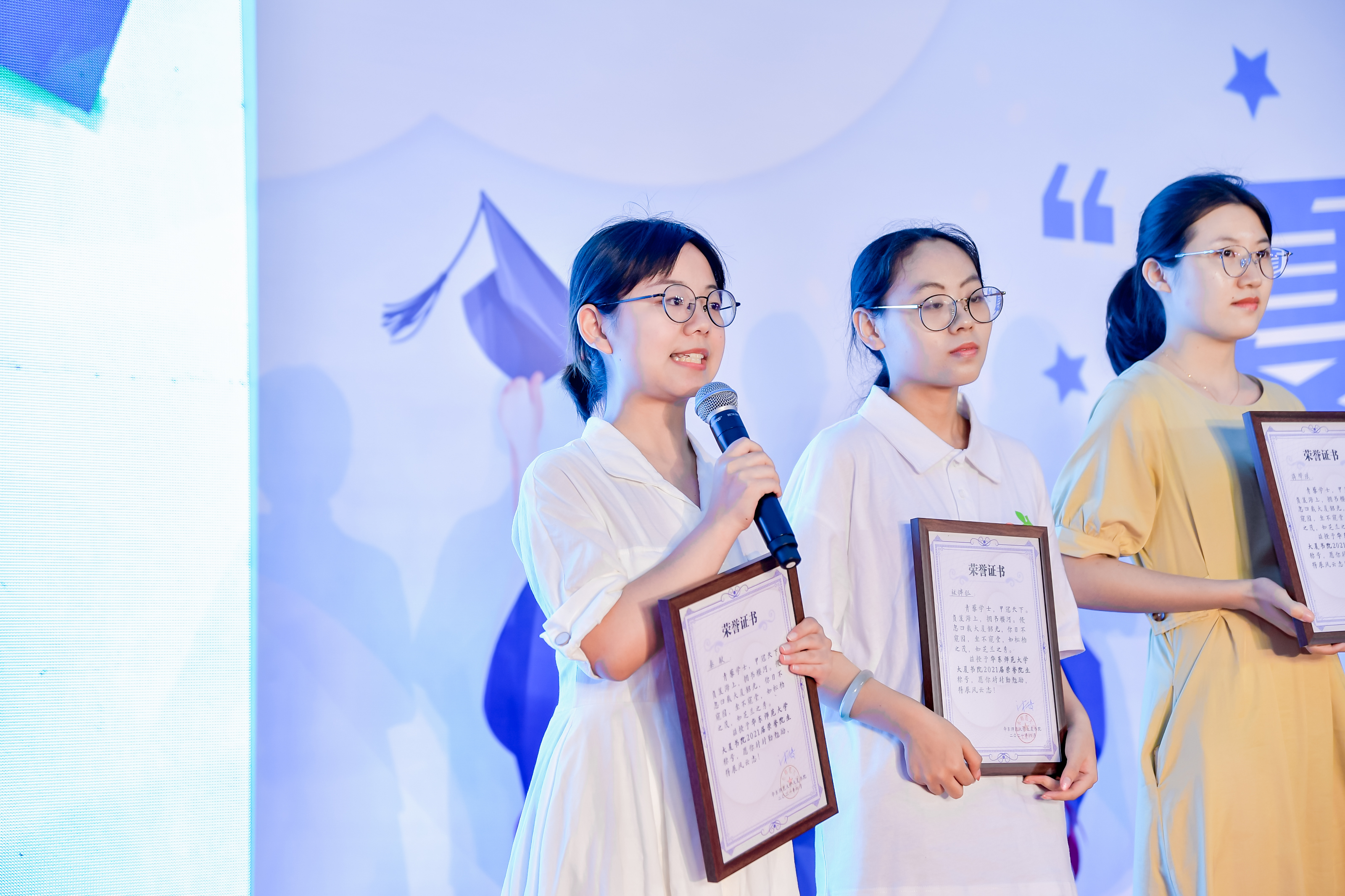 大夏书院党委书记韩春红宣读首届荣誉院生名单。今年书院共评选出101名荣誉院生,由市级与校级优秀毕业生、选调生和集体推荐的优秀学生代表组成,旨在发挥朋辈榜样力量,鼓励书院学子全面发展、追求卓越。与会嘉宾一同为他们颁发证书,点亮璀璨星光。四川省选调生、2017级法学专业何雨珂分享到,青春应当在奉献中闪光,希望走出师大的同学们继续磨砺自我、砥砺前行,成为更优秀的自己。