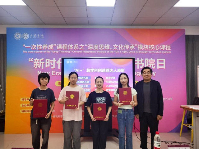 From January to May 2025, Daxia College, in collaboration with the Library, Future Learning Center, Undergraduate School, and Information Governance Office, held the "AI +" Interdisciplinary Innovation Camp. This session of the "AI +" Interdisciplinary Innovation Camp (LEVEL 1) offered 6 micro-course themed courses; LEVEL 2 held 5 in-depth seminar salons, with a total participation of 328 person-times. After strict selection, 4 students won the "Interdisciplinary Talent Award", "Innovative Thinking Talent Award", "AI Digital Intelligence Talent Award", and "Interdisciplinary Teamwork Award" respectively. Wei Mingyang and Liu Junsheng presented certificates to all the graduates and the outstanding candidates.